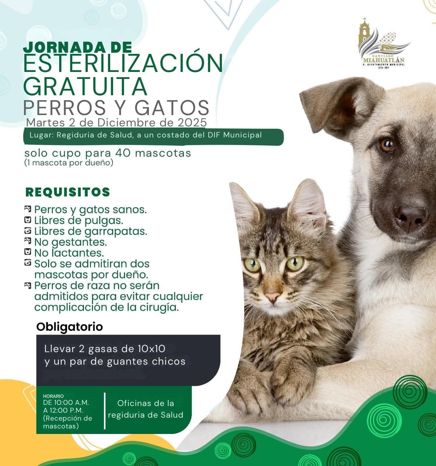Con la finalidad de coadyuvar en evitar la sobrepoblación canina y felina en el municipio de Santiago Miahuatlán, la regiduría de salud municipal convoca a los habitantes para que participen activamente en una jornada de esterilización canina y felina.