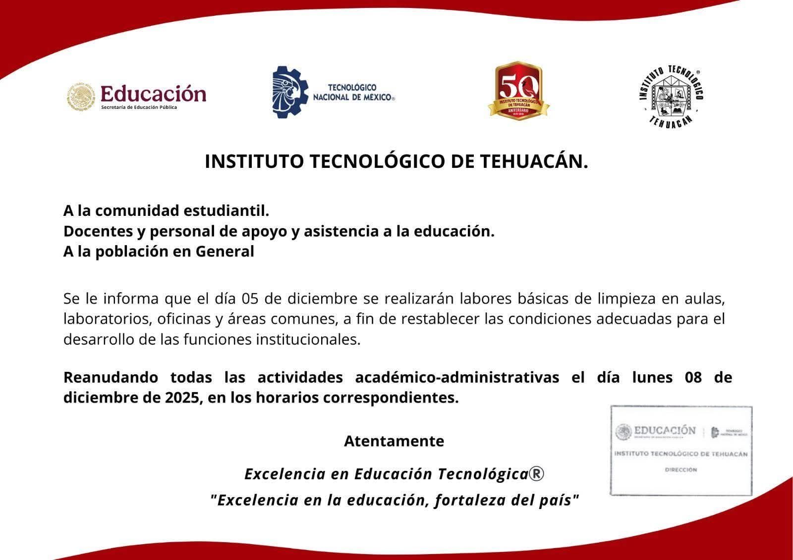 El próximo lunes 08 de diciembre se reanudarán las actividades académico-administrativas al interior del Instituto Tecnológico de Tehuacán después de haber estado cerrado por 50 días por algunos inconformes con la dirección del plantel; trascendiendo lo anterior de acuerdo a un comunicado, que publicó en su cuenta de facebook, la institución educativa.
