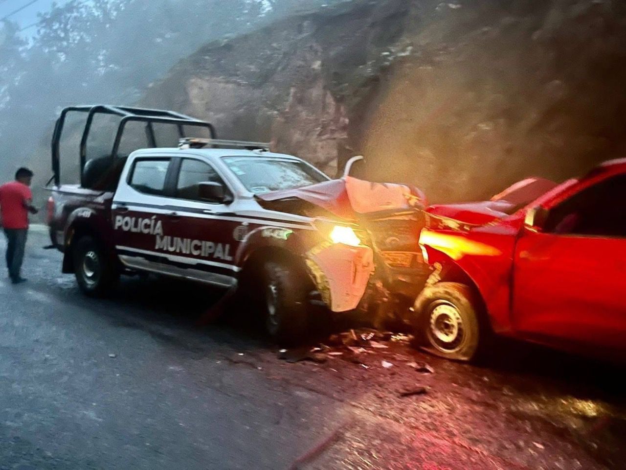 Un fuerte choque se registró en la Sierra Negra, a la altura del arco de acceso al municipio de Zoquitlán, donde una patrulla municipal se impactó con una camioneta Nissan roja que iba cargada con manzanas y viajaban pobladores del municipio de Coyomeapan.