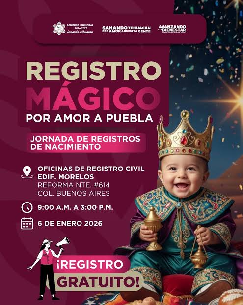 En Tehuacán, se realizará el próximo 6 de enero una Jornada de Registros de Nacimiento denominada “Registro Mágico por Amor a Puebla”, esta acción busca garantizar el derecho a la identidad de niñas y niños.