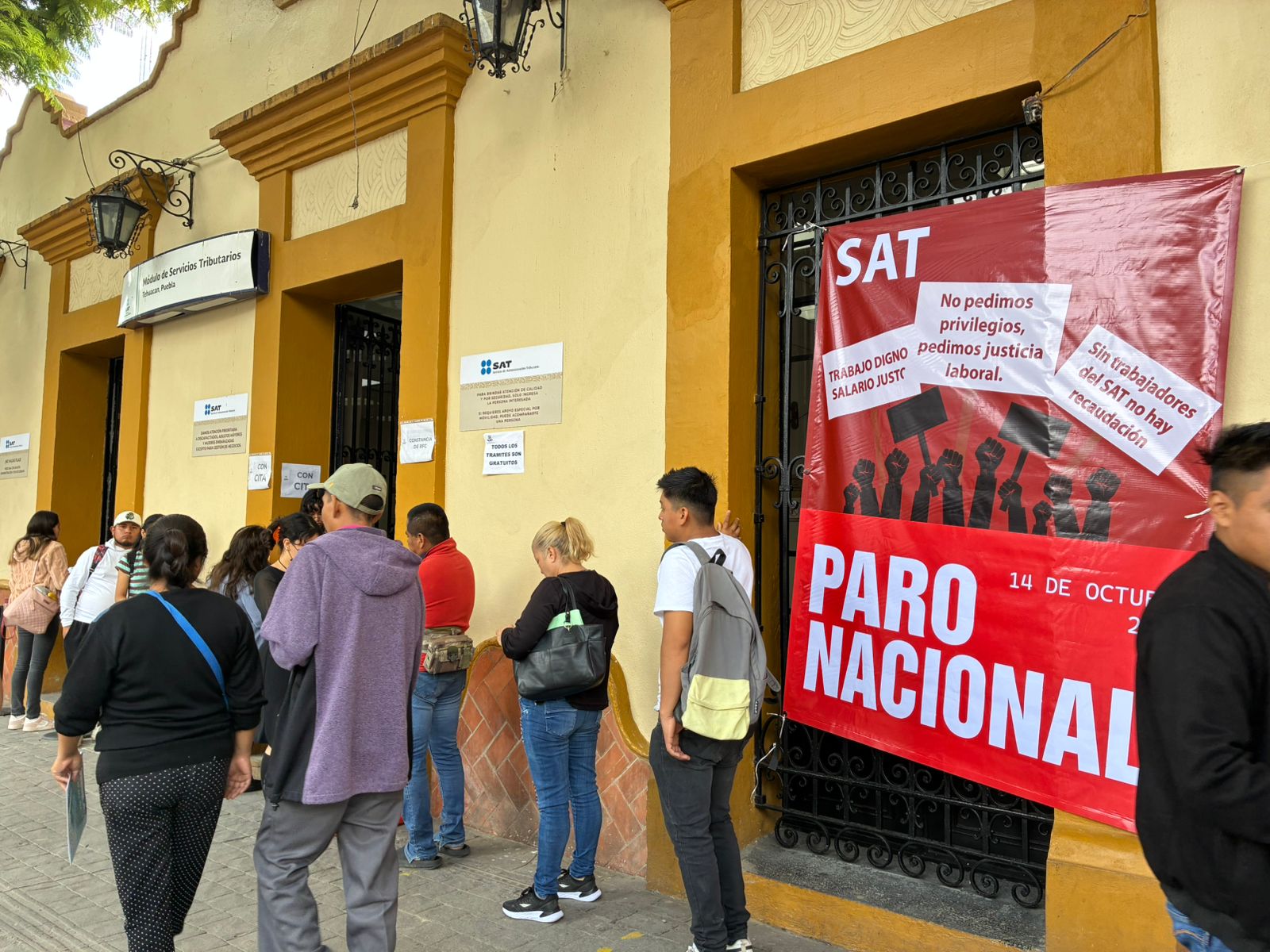 Los trabajadores del Servicio de Administración Tributaria (SAT) en Tehuacán, se sumaron al paro nacional “brazos caídos” convocado este martes, para exigir un incremento salarial y mejores condiciones laborales.